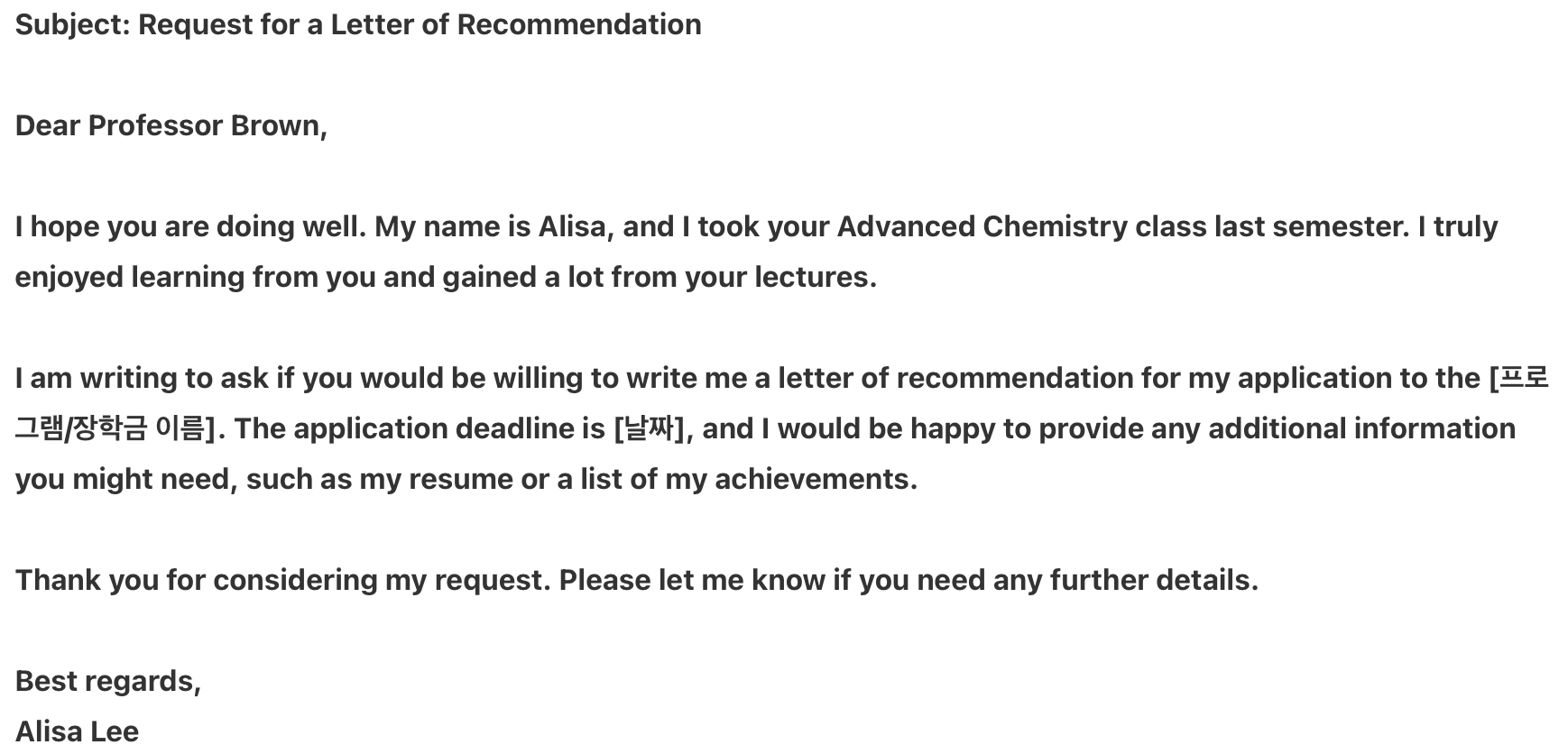 장학금 등을 위한 추천서를 요청할 때 쓸 수 있는 메일입니다!