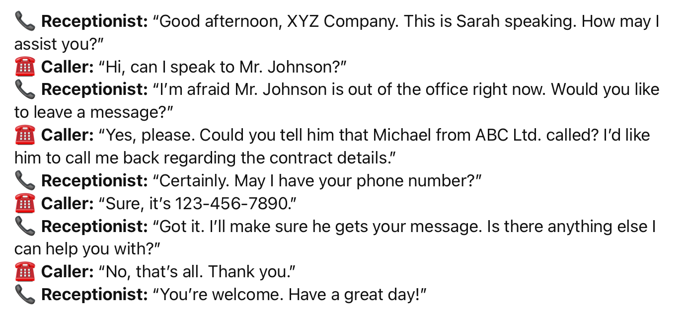 📞 Receiver: “I’m afraid he’s out of the office right now. Would you like to leave a message?”